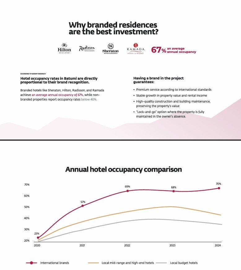 Ramada Residences Batumi is located in the most desirable and bustling district of Batumi – just one block from the seafront, on Alley of Heroes, which is rapidly transforming into a mini-Dubai, attracting tourists from Europe and the Middle East with its vibrant and modern style. The prime location provides proximity to major attractions, central avenues, coastal recreational infrastructure, government institutions, key shopping centers, and business hubs. This makes Ramada Residences the perfect choice for both short-term and mid-term stays in Batumi. In the next 3-5 years, Alley of Heroes will evolve into a vibrant and fully developed city center, attracting tourists, businesspeople, and casino-goers year-round