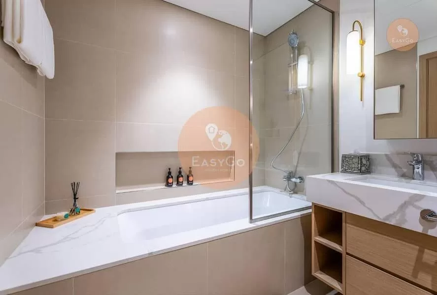 EasyGo Holiday Homes is pleased to offer this luxurious and spacious Two Bedroom apartment providing luxury facilities of comfort. The master bedroom include a king-sized bed, and second bedroom include a 2 single bed, built-in wardrobes, and an en-suite bathroom. Enjoy cooking in the fully fitted kitchen with the best European appliances such as a refrigerator, dishwasher, washing machine, microwave, oven and kitchen utensils with inbuilt wooden cabinets.