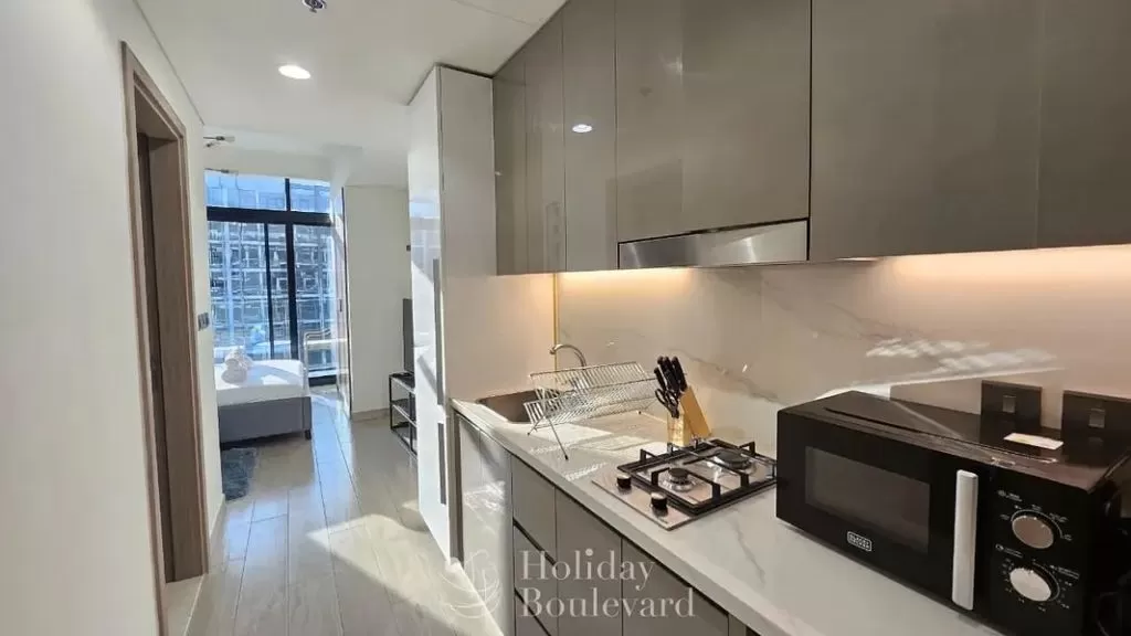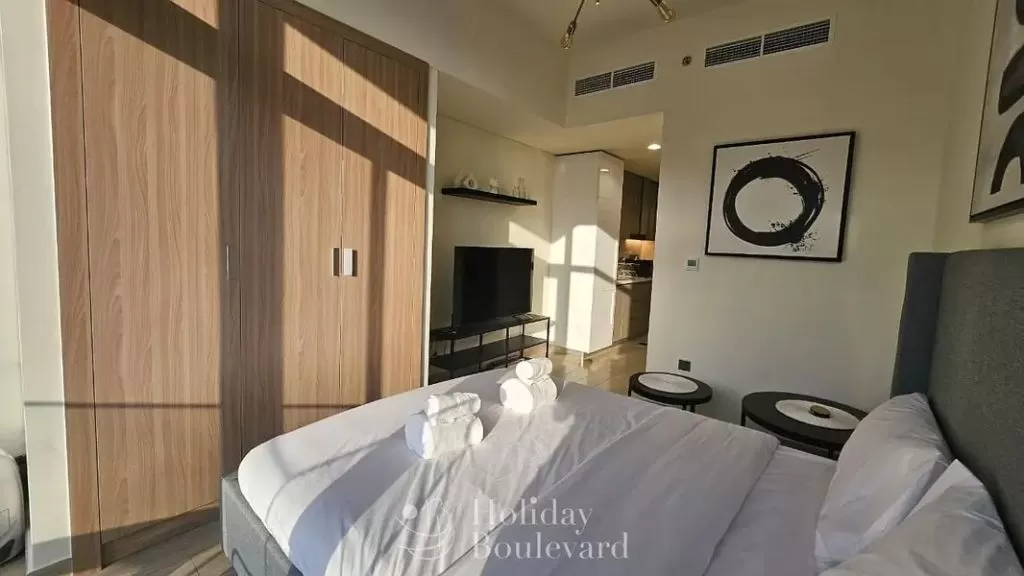 Boulevard Holiday Homes is Glad to present to you this Chic studio apartment for short term rent in Azizi Riviera 33 at Meydan City, Dubai.