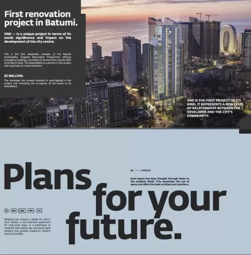 First residential building in the centre of Batumi Each apartment is designed for comfortable long term living. This makes them ideal for both seasonal rentals and permanent residencyFirst renovation project in Batumi. ONE is the first project of its kind. It represents a new level of relationship between the developer and the city's community.  according to Government Decree ONE of 29 March 2022. The Municipality is a partner in the project and supervises its implementation. The developer has already invested in participating in the project and relocating the occupants of the house to be demolished