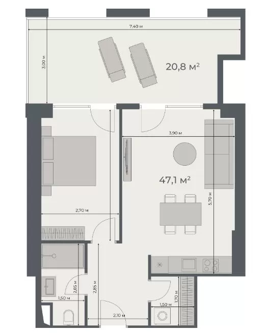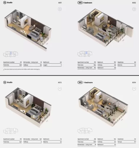 A wide variety of layouts: from 27,7 sq. m studio to 121,3 sq. m three-bedroom apartments.