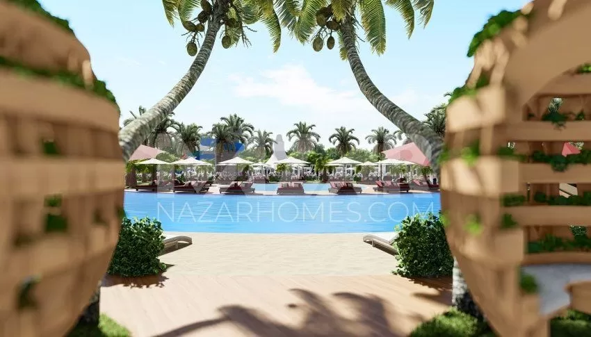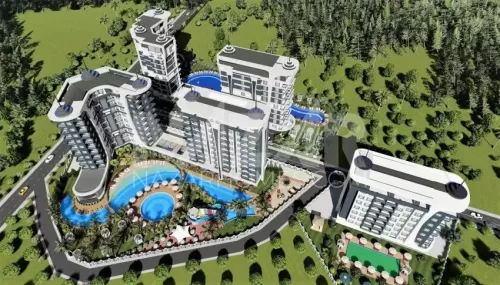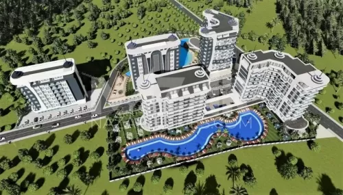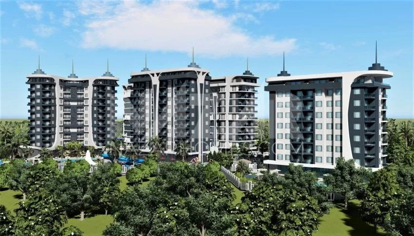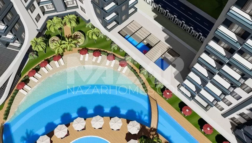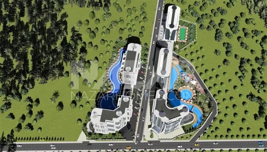 Site amenities include outdoor and indoor swimming pools, a water park, sports fields, children's play areas, and relaxation areas. Additionally, spa and health facilities such as a Turkish bath, sauna, massage rooms, and a fitness center ensure residents' relaxation. Security and comfort are ensured with services like a concierge, open parking, and a generator.