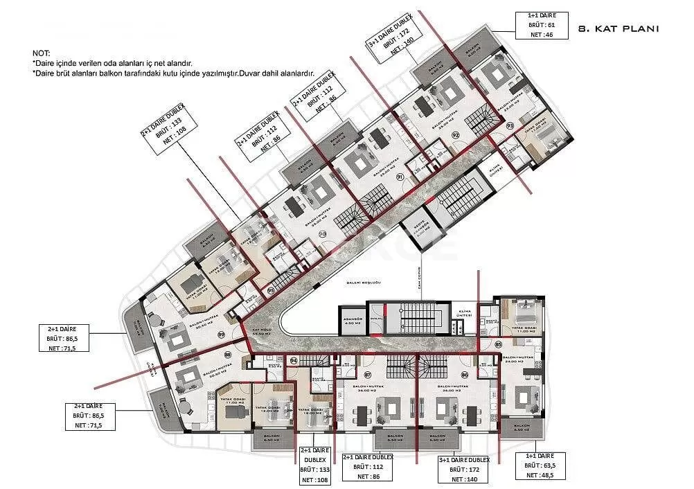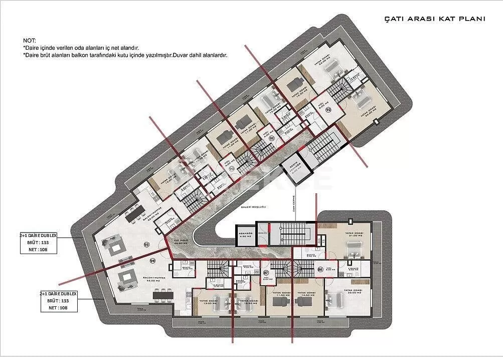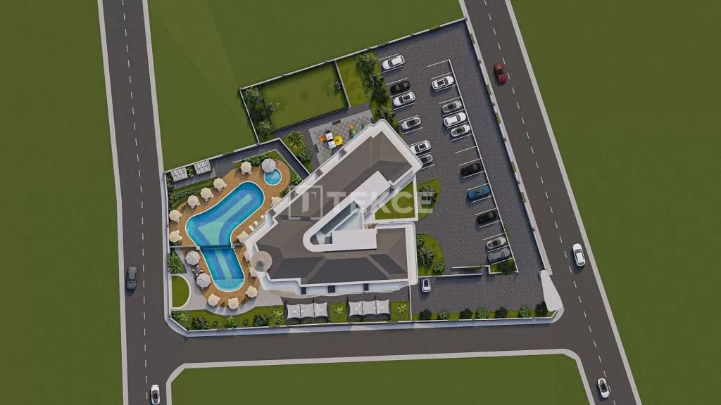 The complex features a great variety of amenities such as; a swimming pool, a kids pool, an indoor swimming pool, a Turkish bath, a sauna, a steam room, a gym, indoor and outdoor parking lots, a cafe, a sports field, barbeque area, sunbathing areas, resting areas, snack bar, and rooms for other activities. Besides, there is a double lift, central satellite system, a generator, water tank, air conditioning infrastructure, Wİ-Fİ infrastructure, intercom system, fire cabinets, and fire escape.