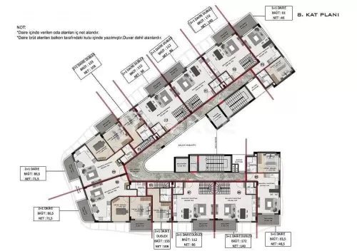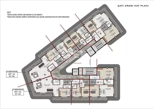 The complex includes 1 1-bedroom flat on the middle floor also 2 and 3-bedroom duplex flats on the rooftop. The interior parts of the flats are equipped with a ceiling floor, spotlighting, erasable wall paints, ceramic tiles, a water boiler, aluminum-based glass balcony parapets, bathroom furniture, and armatures. AYT-02647