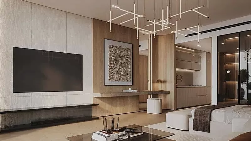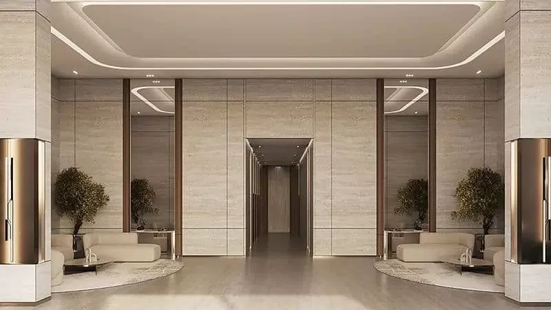 Binghatti Ivory’s façade is a visual masterpiece, featuring a harmonious blend of crystalline glass, brushed brass, and metal mesh, creating an iconic addition to Dubai’s skyline. The luxuriously crafted interiors showcase high-end materials like tan oak wood, black-tinted glass, and exotic green porcelain, offering a warm yet sophisticated ambiance.